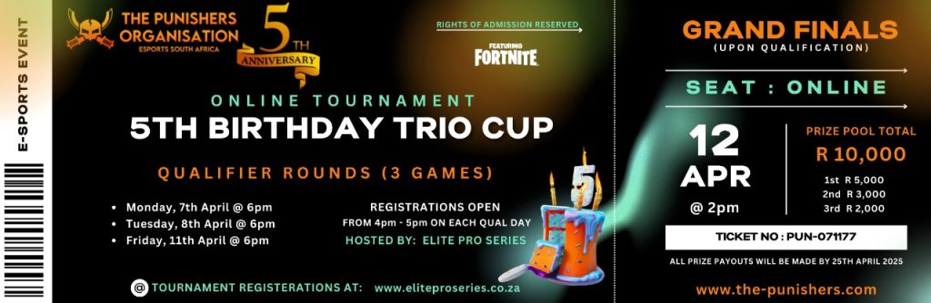 Get ready for an epic showdown as The Punishers Organisation marks itsย fifth anniversary with theย 5th Birthday Trio Cup, anย online Fortnite tournament that combinesย skill, strategy, and celebration!